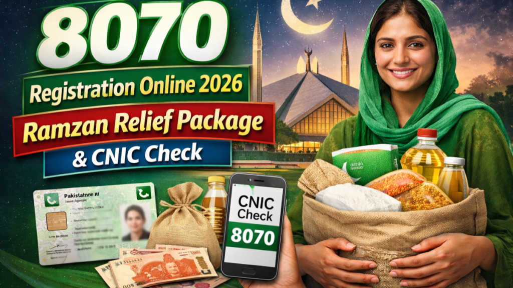 The 8070 Registration Online 2026 system has been introduced to help low-income families across Pakistan benefit from the 8070 Ramzan Relief Package 2026. Through the official 8070 web portal, citizens can easily check their eligibility by entering their 13-digit CNIC number and completing the online registration process. This government relief initiative aims to provide financial assistance and subsidized essential food items during the holy month of Ramadan, helping deserving households manage rising living expenses and daily needs. The digital 8070 CNIC check system makes the process simple, transparent, and accessible for people across the country.